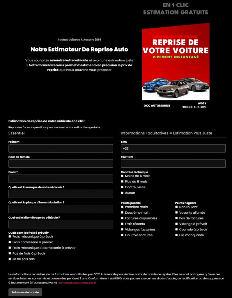 Pour OCC Automobile, nous avons connecté la campagne à un formulaire Brevo. Ce questionnaire en ligne permet de collecter des informations précieuses sur les véhicules à reprendre : état, avis, coordonnées du client, etc. L’avantage majeur ? Les données sont automatiquement synchronisées avec le site internet du client. Cela évite toute saisie manuelle, améliore la qualité des leads et permet un traitement plus rapide.