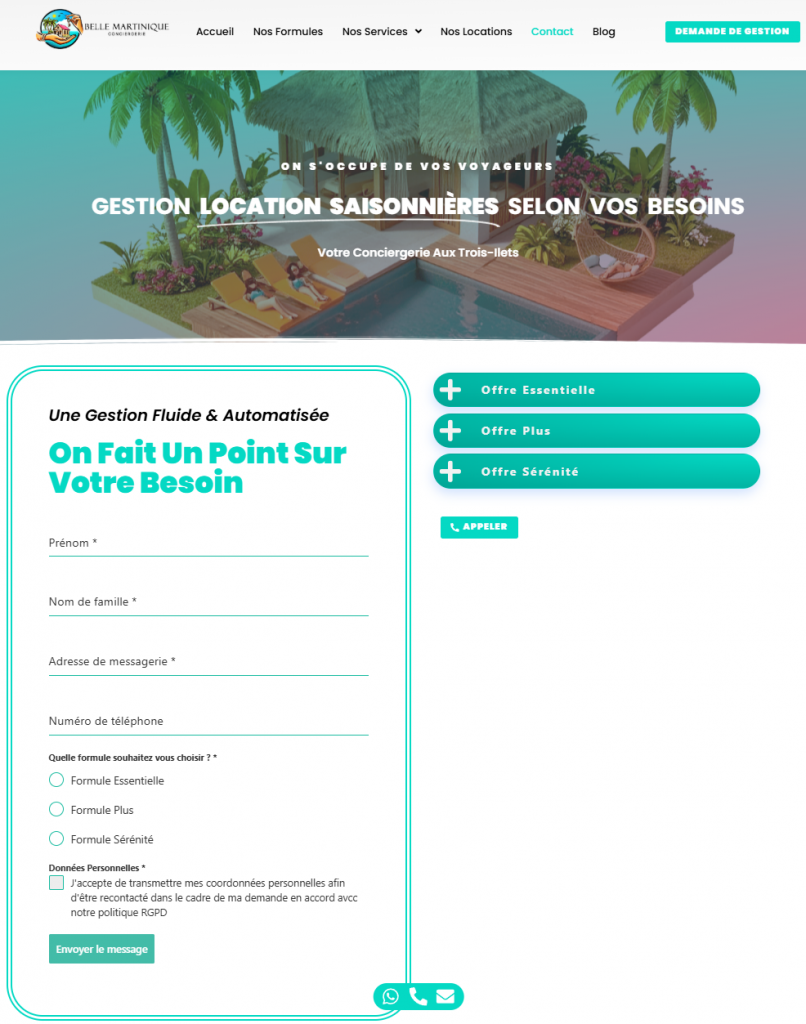 En complément du flyer, nous avons également conçu le site internet de Douce Martinique Conciergerie. Ce site reprend les mêmes codes graphiques et les mêmes valeurs que les supports imprimés pour offrir une expérience fluide et cohérente. Responsive, intuitif et orienté conversion, il contribue à renforcer la visibilité et la crédibilité de l’agence sur le web.