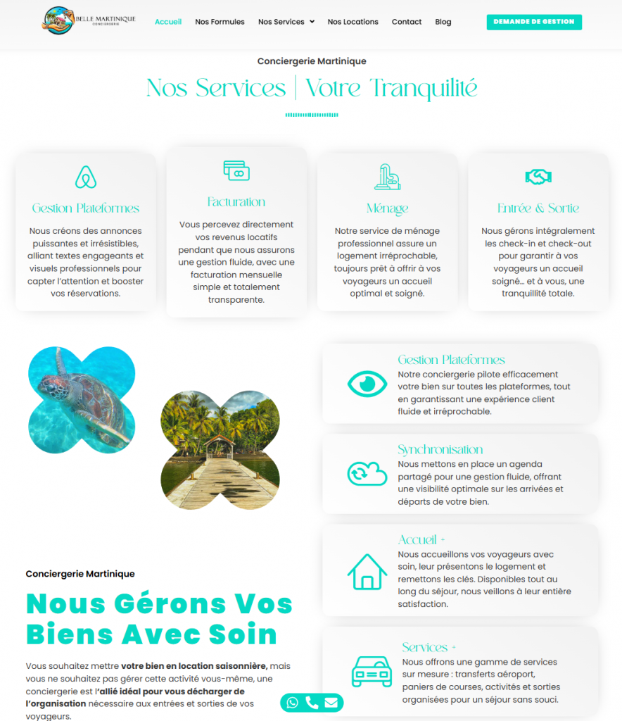 Les services sont formulés de manière à rassurer et convaincre en quelques mots : accueil personnalisé, ménage professionnel avec linge hôtelier, gestion des réservations 7j/7, optimisation de l’annonce et des tarifs, maintenance technique. Chaque point a été positionné pour mettre en avant la rigueur et le professionnalisme de Belle Martinique Conciergerie.