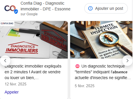 En parallèle, nous avons mis en place une stratégie de publications régulières sur Google My Business. Ces posts, adaptés aux activités et actualités de Confia Diag, mettent en avant les services, promotions éventuelles et conseils pratiques. Chaque post intègre des mots-clés stratégiques pour renforcer le référencement naturel.